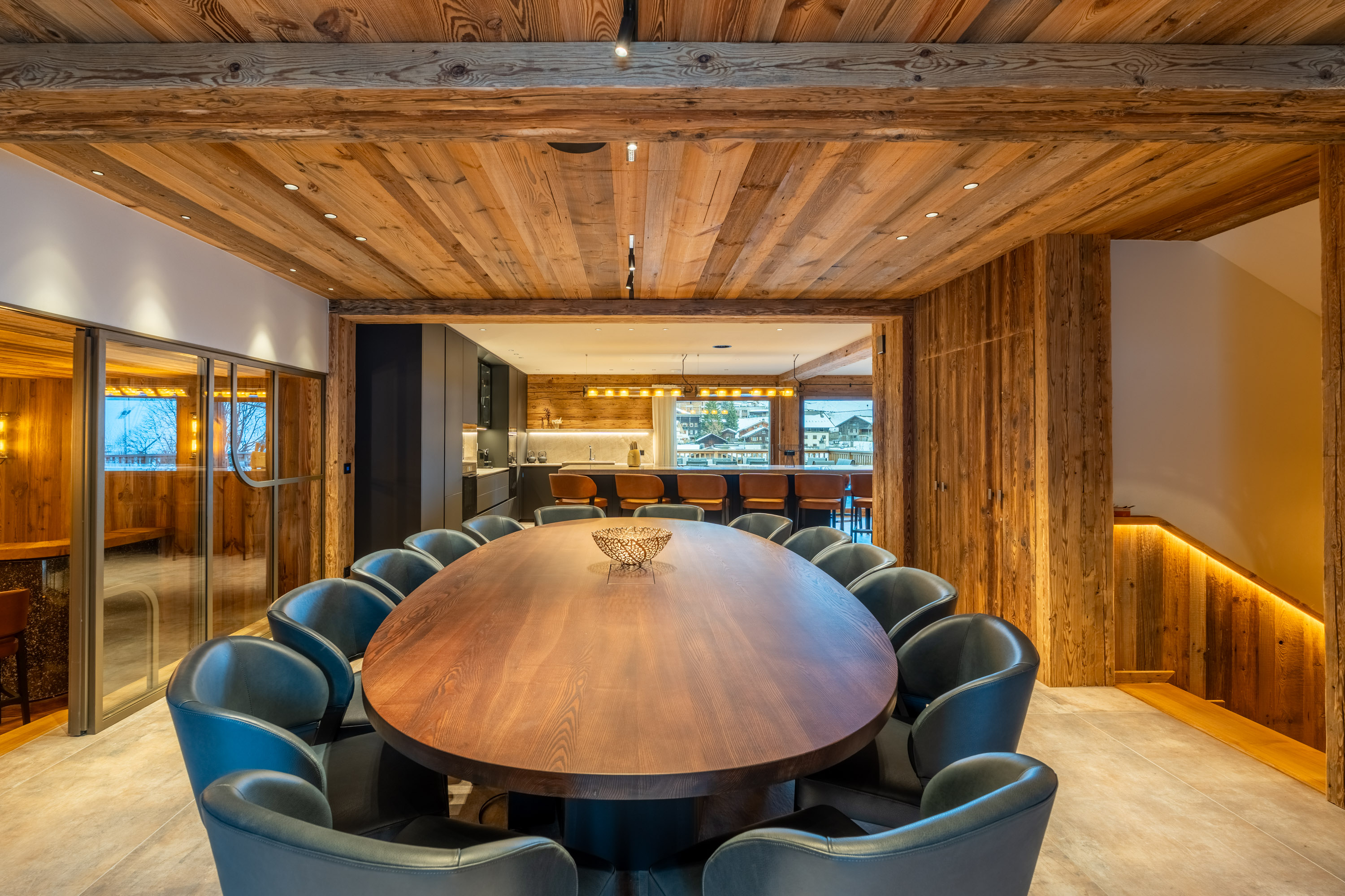 Les baies coulissantes disparaissent dans les murs, fusionnant ainsi la salle à manger avec l'extérieur et donnant accès à la terrasse, parfaite pour profiter des belles journées en montagne. Pour une expérience encore plus agréable, vous avez la possibilité de faire appel à des prestataires extérieurs pour préparer vos repas ou de faire vos courses avant votre arrivée, afin de profiter pleinement de votre séjour sans souci. Ce lieu combine confort, fonctionnalité et une vue spectaculaire, créant ainsi l'endroit idéal pour des moments de partage autour d'un bon repas.